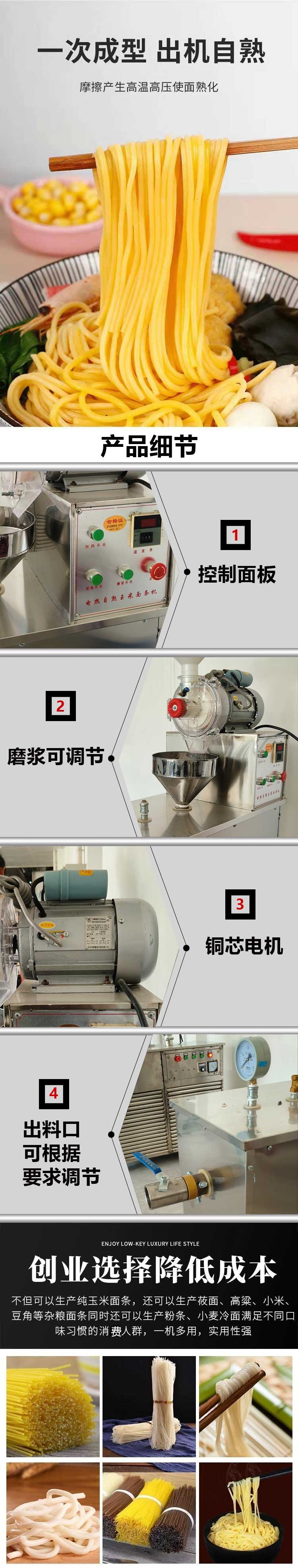 多功能玉米面條機(jī)具有設(shè)計(jì)新穎、結(jié)構(gòu)合理、造型美觀、操作簡單、清理維修方便、接通電源即可生產(chǎn)等特點(diǎn)。該機(jī)主要用于生產(chǎn)玉米為原料的內(nèi)熟面條,還能生產(chǎn)各種面條,麻辣條,牛筋面以及米線等。